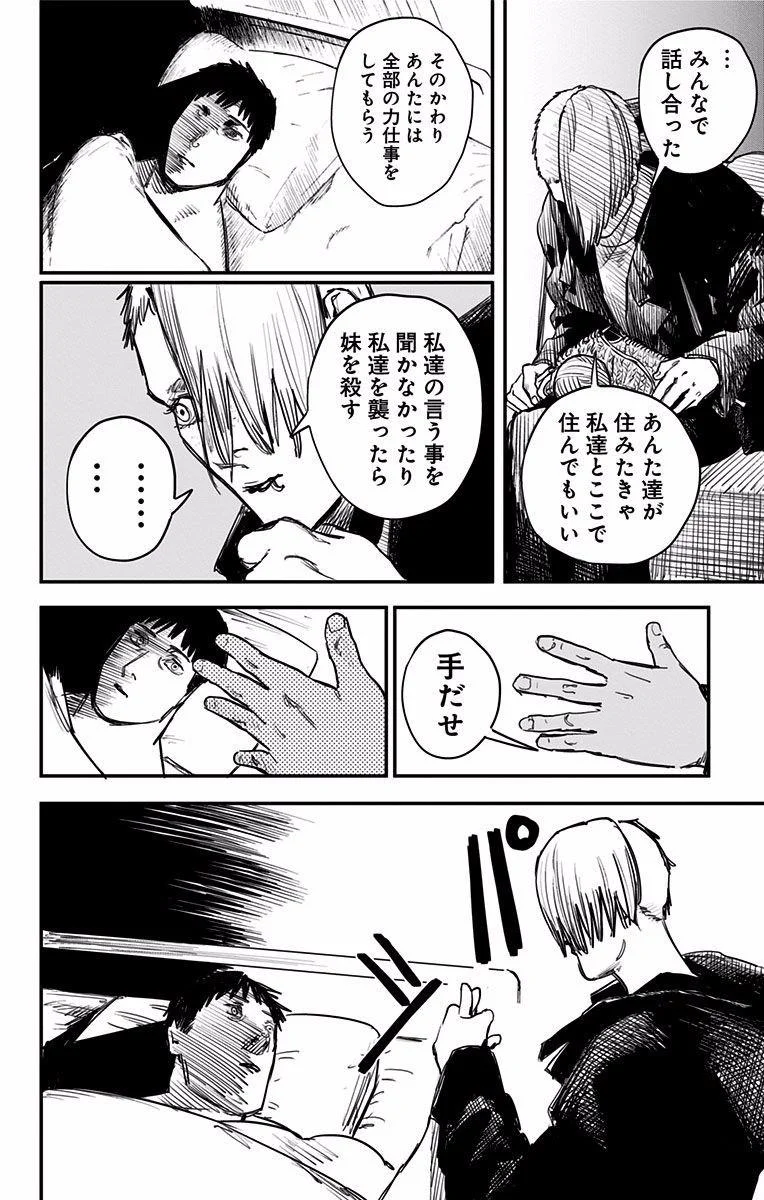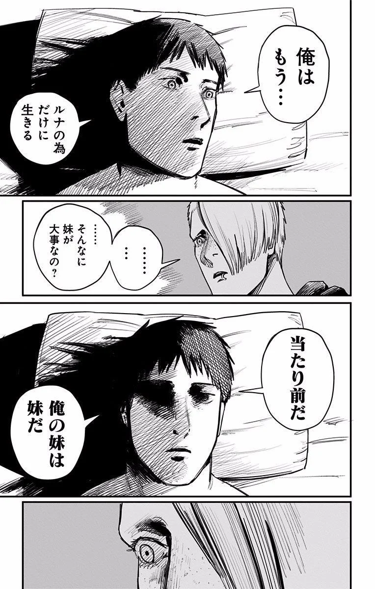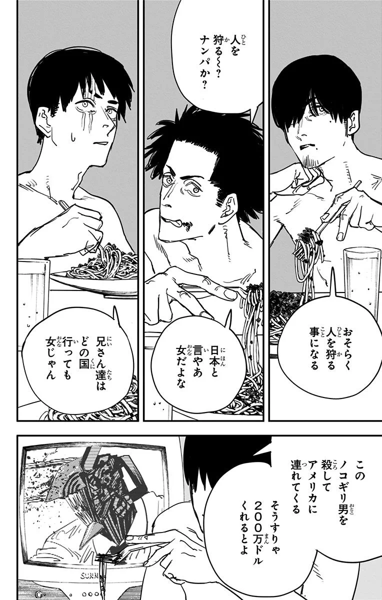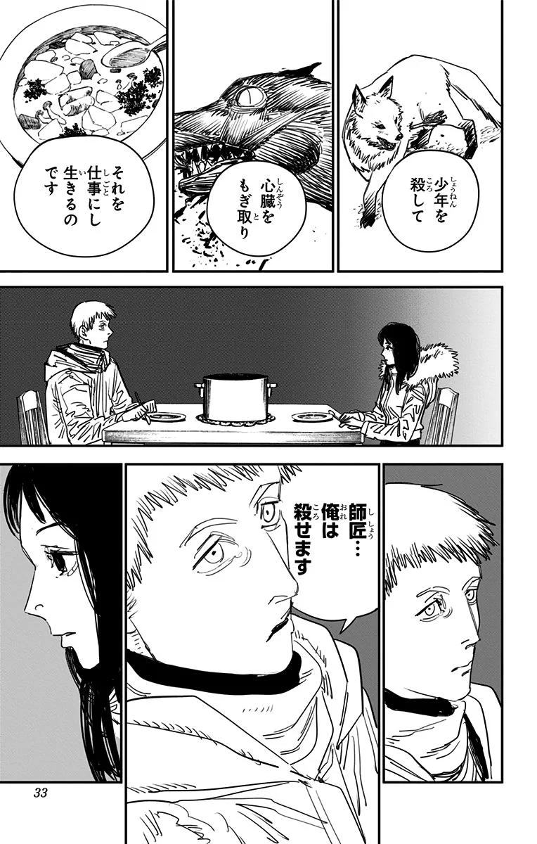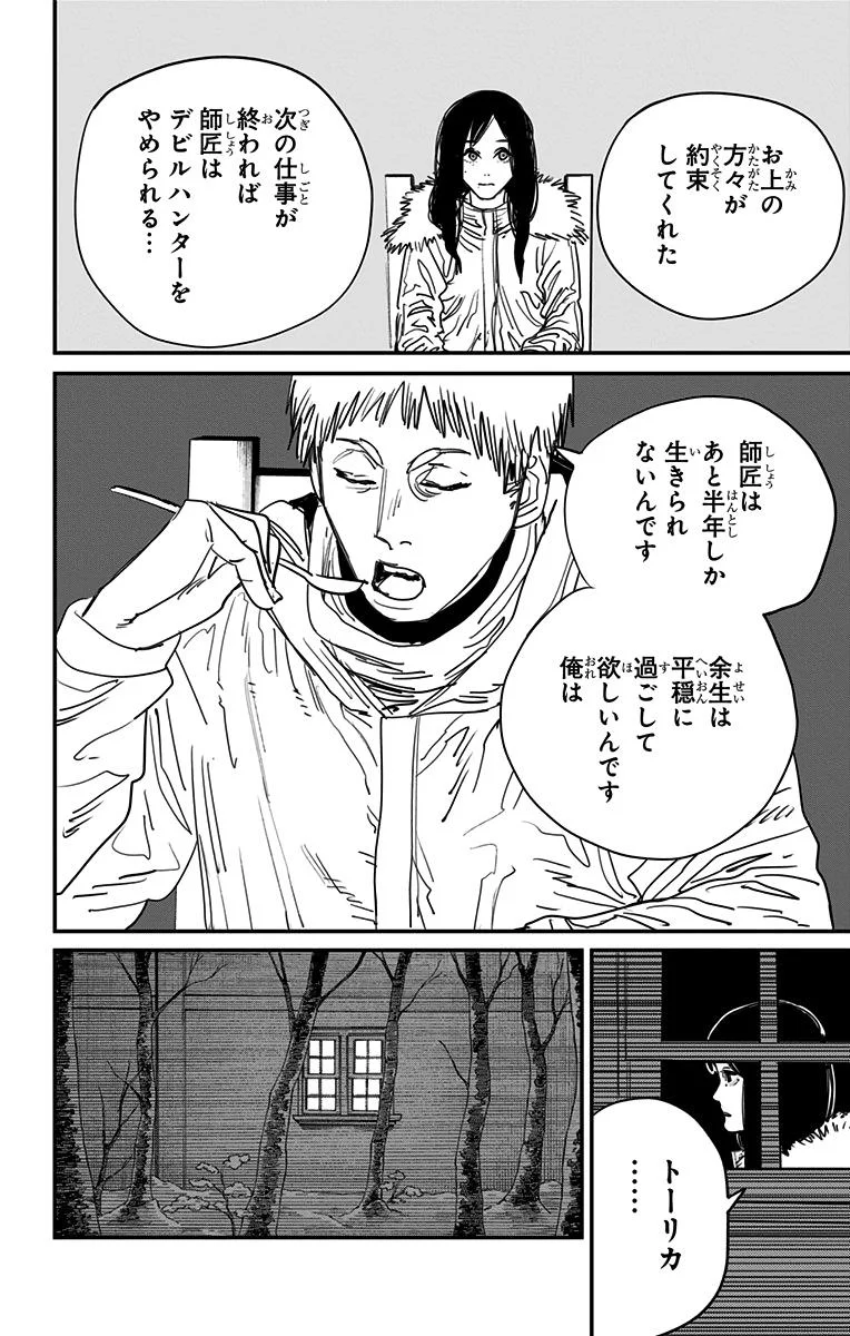 【整个故事的结局都是事先就定好的吗?】 藤本树:大致决定了。 林士平:大致如此。之后我们反复进行了粗略的讨论。我们交换了一些想法,藤本先生表示他会采纳,然后他又修改了方案。大致就是这样。我们讨论了我们是否走在正确的道路上。 藤本树:只要有电次和真纪真在,结局就已注定了,我想。 林士平:卷数是事先定好的。所以只需要思考如何结尾。我们讨论了很久,在完结前好几卷就开始讨论了。