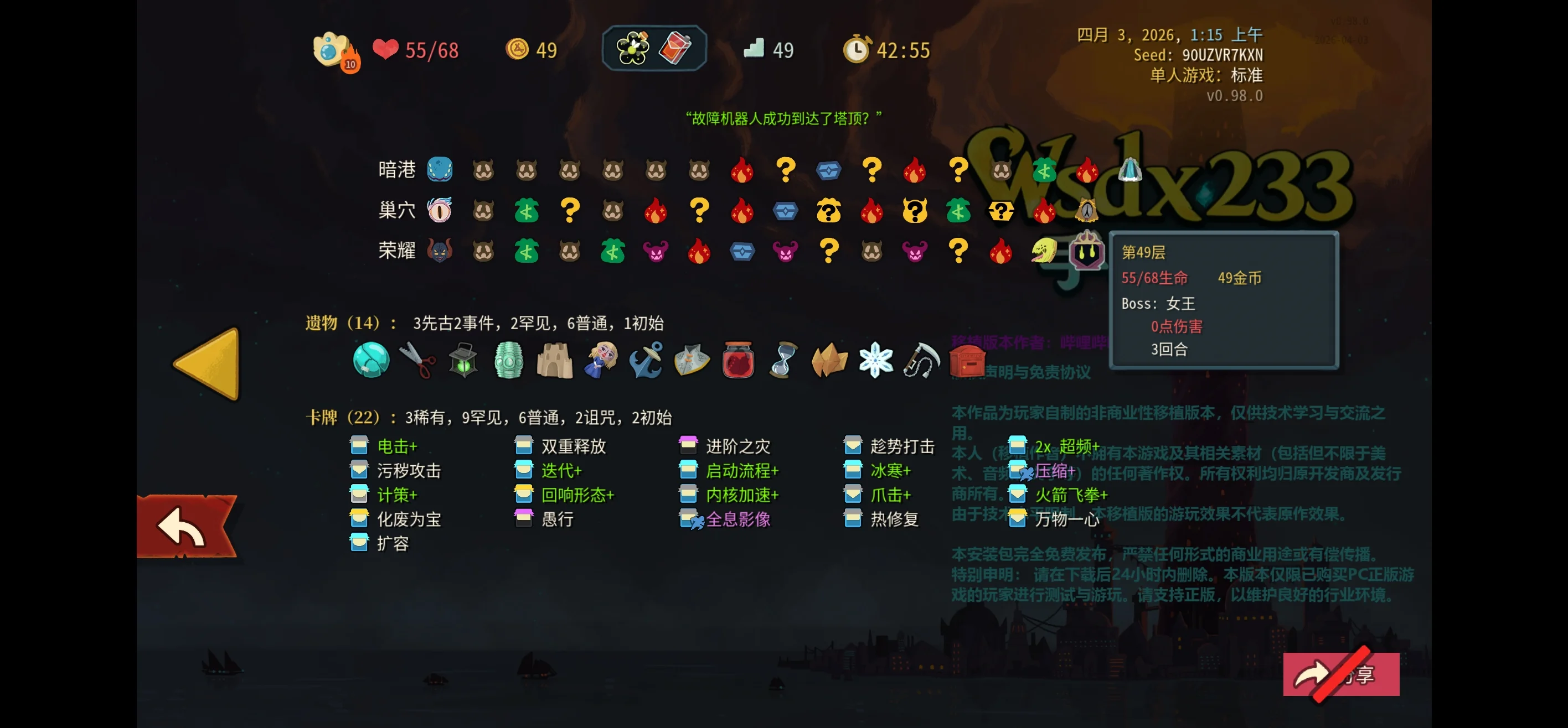 其次目前尖塔2难度偏高, 尤其是1层, 初始卡组打3场被削成血皮 或者被1层精英/boss克制是正常体验. 只能尽量刷到好图尽量提高理解让卡组好些.
