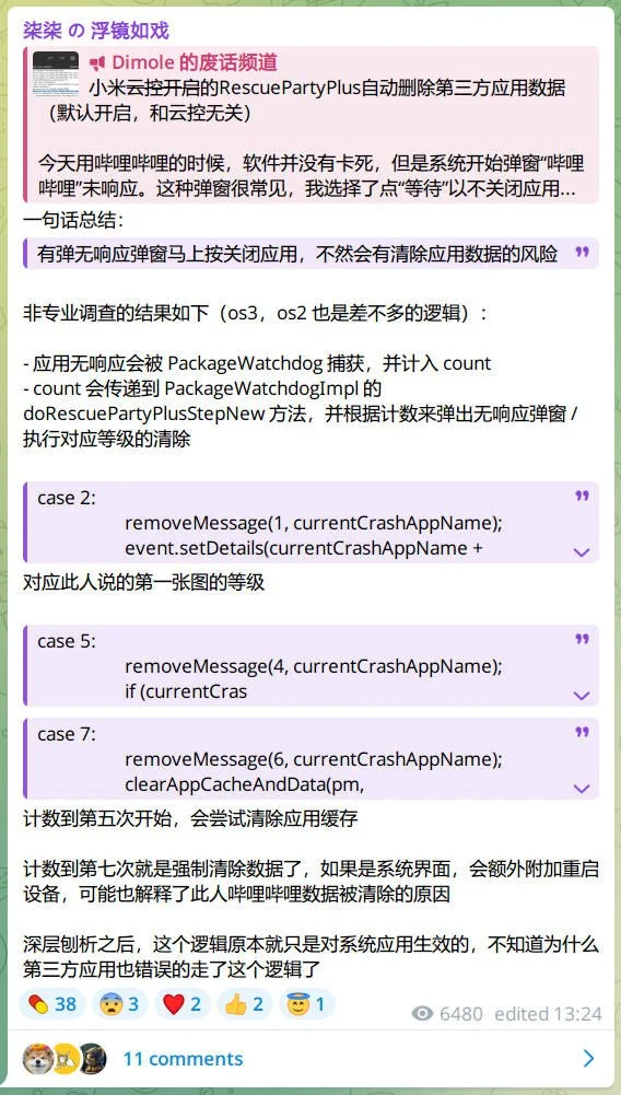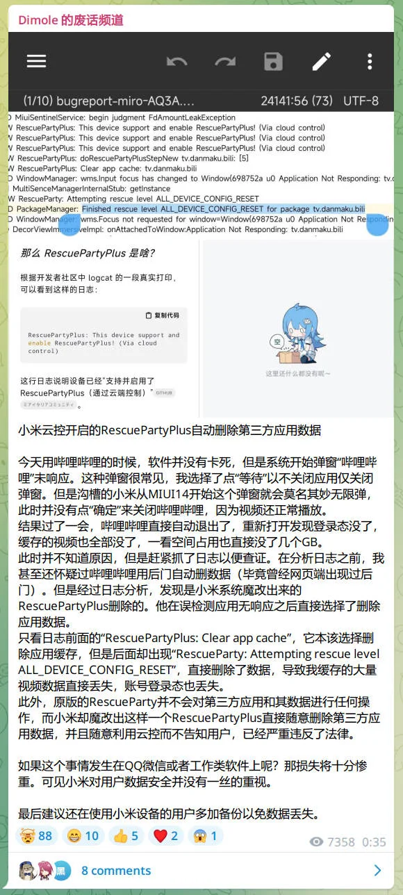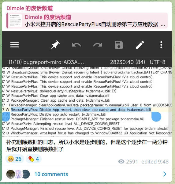此时并不知道原因,但是赶紧抓了日志以便查证。在分析日志之前,我甚至还怀疑过哔哩哔哩用后门自动删数据(毕竟曾经网页端出现过后门)。但是经过日志分析,发现是小米系统魔改出来的RescuePartyPlus删除的。他在误检测应用无响应之后直接选择了删除应用数据。
